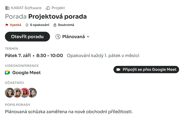 Vytvárajte porady s kýmkoľvek a kedykoľvek. Následne ich synchronizujte s vaším kalendárom. ALITEO umožňuje definovať ich obsah, vytvárať body porady a prepájať ich s úlohami.